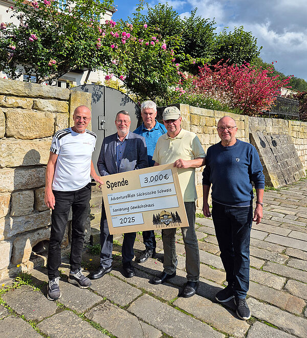 Anlässlich des AdventureWalk Sächsische Schweiz unterstützen wir die Instandsetzung des unteren Teils der Altendorfer Dorfbachklamm in Bad Schandau mit einem Spendenscheck in Höhe von 3.195 Euro. Vor allem einige Treppen können dank der Spende gesäubert und saniert werden.